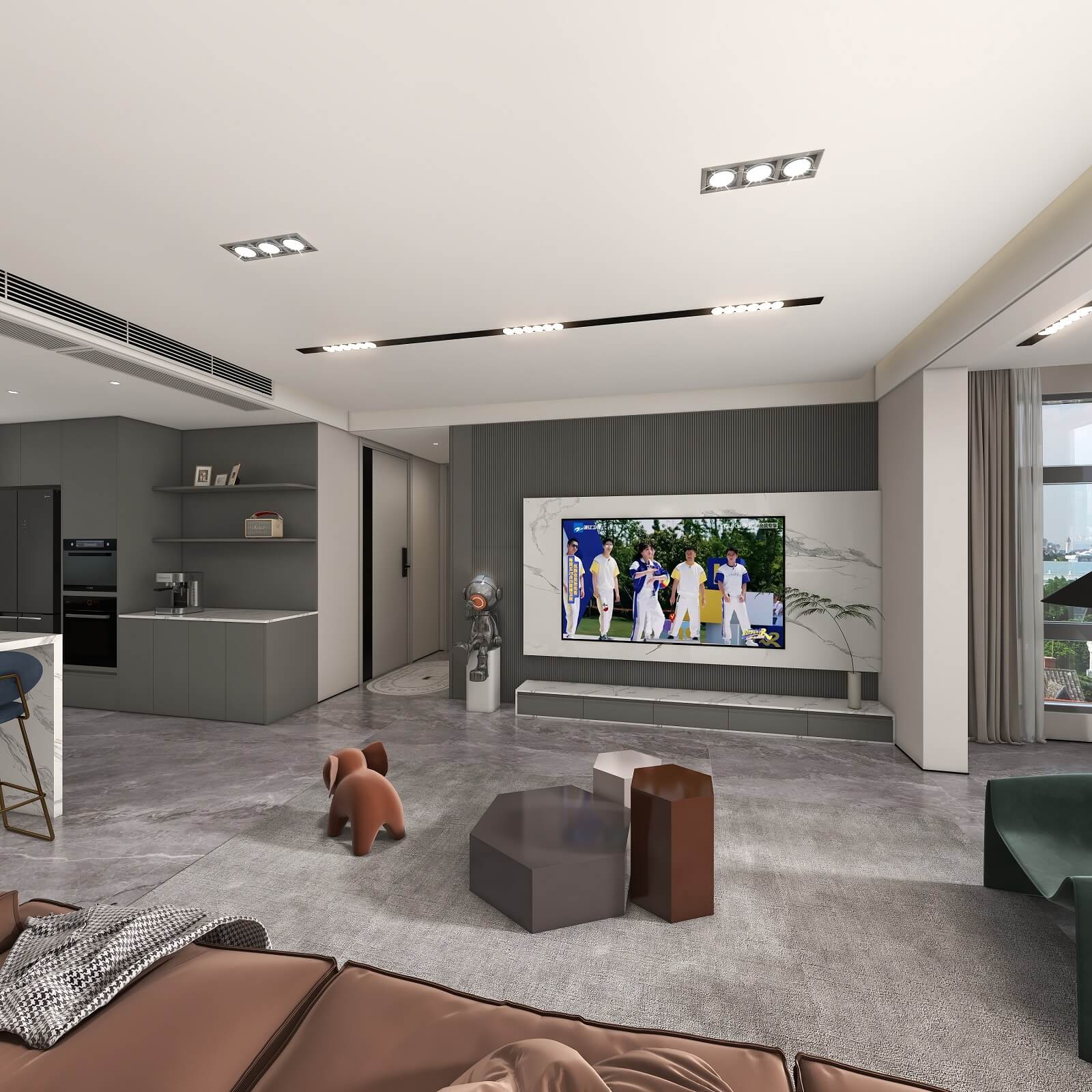 光影流动,木饰面、大理石、木格栅交织出不同层次秩序,给予空间精致质感。